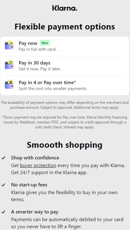 Pay in 4 with Klarna through our app, with integrated brands, or anywhere Visa is accepted.