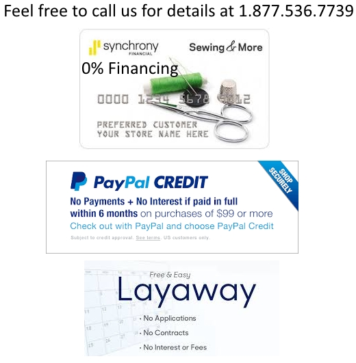 On qualifying purchases of $150 to $1,999.99 made with your Sewing & More credit card. Interest will be charged to your account from the purchase date if the promotional balance is not paid in full within 6 months. Minimum monthly payments required.