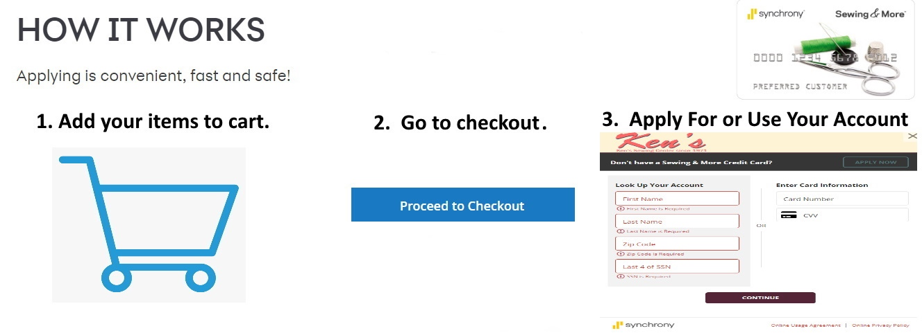 Ken's Sewing & Vacuum Center is proud to offer easy financing thru Synchrony. Buy now and pay later with monthly financing plans. Now you can apply onine, place your order and pay online. Just place the items you want to purchase in your card and go to checkout. You will have the option to choose Synchony as you payment method. Then you will be able to apply for a Sewing & More Card and finish your order.