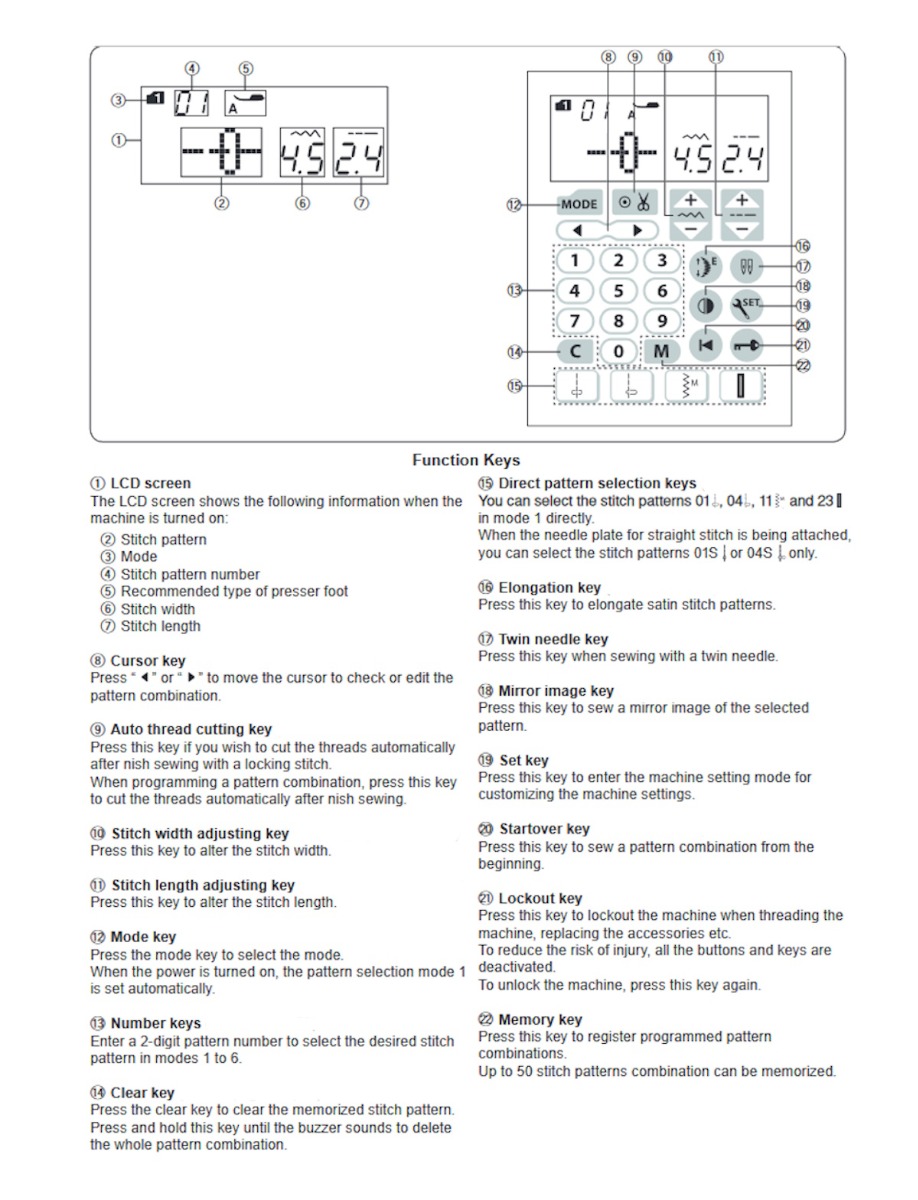 The Backlit Digital LCD Screen shows a range of data for stitches and the feet selection. This very helpful sewing information is displayed in crisp, clear characters with a backlit option to help with visibility. Easy navigation keys are located near the screen and allow the user to easily select a stitch choice and for customization.