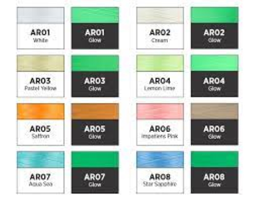View the colour chart below to see a comparison of how each Wonderfil Ahrora Glow in the Dark Thread glows in the dark.